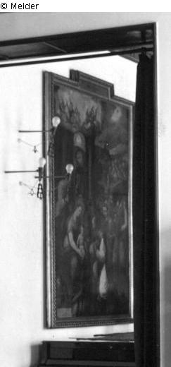 Lateinische Widmung: „Tres reges regum regit tria dona dicarunt / Etodidem trino didigo dona deo / Jo. Alousius, Alexius, 1600“, Stifterwappen.