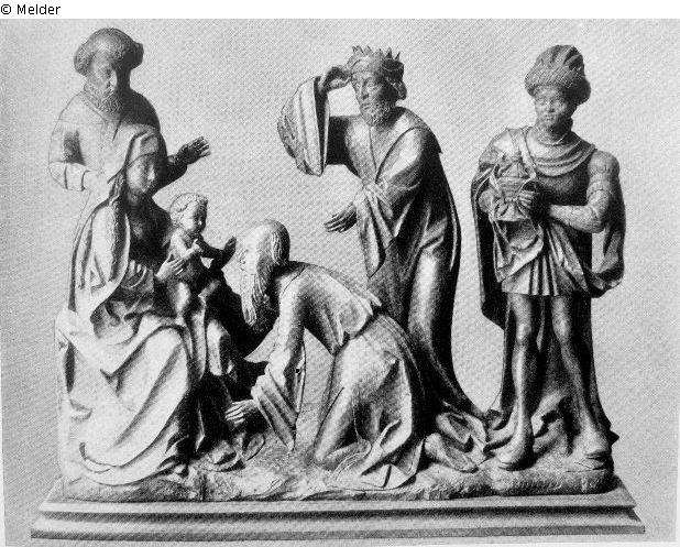 Links vor dem stehenden Josef sitzt Maria mit dem Kind, zu ihrer Seite kniend ein König, die beiden anderen rechts stehend, der Mohr mit einem in ein Tuch gehülltes Gefäß. Kleine Ergänzungen, der rechte Arm des Kindes abgebrochen. Abbildung Versteigerungskatalog Tafel 38