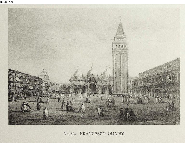 Der Markusplatz in Venedig. Im Hintergrund der Dogenpalast. Etwas weiter rechts steht der hohe, quadratische Turm von St. Marco. Auf dem Platz bewegen sich zahlreiche Figuren. [Marginalie:] nicht Guardi