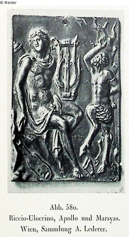 Bange-WV, Nr.: 424 (Α. N. 721. Inv. 1059.) Titel: Apollo und Marsyas. Apollo mit Schultermantel und Köcher sitzt links auf einem Felsstück, die Leier auf dem Knie, in der Rechten das Piektrum. Singend wendet er das Haupt nach links. Rechts Marsyas, als Satyr an einen Baum gebunden; zu seinen Füßen die Syrinx. Oben neben dem Geäst des Baumes ein v, wie es Ulocrino zu Anfang und Schluß seines Namens zu geben pflegt. Halbrelief. Bronze. H. 6,6, Br. 4,9 cm, Am oberen Rande gelocht;
