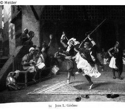 Zwei Männer in reicher Tracht tanzen, links Musikanten, rechts hinten Zuschauer. Auf der Bank links bezeichnet: "J. L. Gérôme."