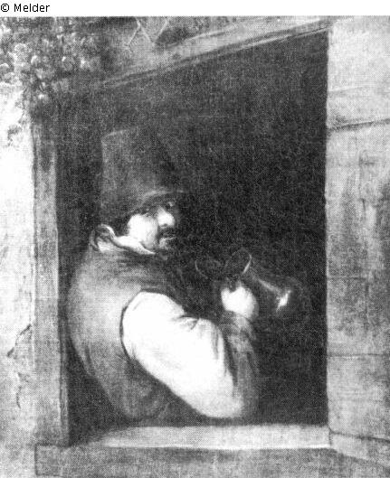 Depicted bust length in a vest and black hat, holding a pewter mug. Head turned three quarter to the right. Signed bottom right.