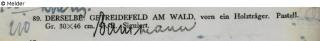 Sammlung Eduard Fuchs bis 1933; 25.10.1933 Beschlagnahmung durch die Gestapo; zwangsweiser Verkauf (Zahlung Reichsfluchtsteuer) 1937 durch seine Tochter Gertraud Fuchs: Versteigerung Rudolph Lepke, Katalog 2114, 16. und 17.06.1937, Nr. 89 („Getreidefeld am Wald, vorn ein Holzträger. Goldrahmen“); Erwerb durch Kunsthändler Hans Bammann, Düsseldorf (laut annotiertem Katalog der RKD Den Haag - Niederländisches Institut für Kunstgeschichte) für 250,- RM (Schätzpreis 210,- RM); Privatsammlung Süddeutschland; 01.06.2001 Kunsthaus Lempertz, Köln (für DM 100.000,- versteigert); im Mai 2019 soll das Pastell bei der Villa Grisebach Berlin versteigert werden - derzeit finden Restitutionsverhandlungen statt
