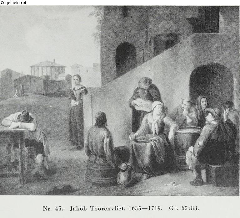 im Vordergrund versammelt sich eine trinkende Gesellschaft an mehreren tischen im Freien bei einer Schenke vor einem Treppenaufgang; im Hintergrund werden Zitate römischer Architekturen, darunter der Vesta-Tempel von Tivoli, erkennbar