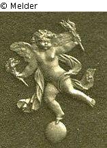 Metallkunst - Möbelbeschlag in vergoldeter Bronze. Putte mit zwei Fackeln auf Kugel stehend.