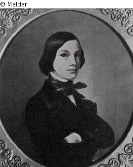 Medaillon; Knabenporträt. Der damals 12-jährige Junge, in Samtjacke mit aufgebauschtem Rockaufschlag und wehendem Schlips ist rechtshin als Halbfigur dargestellt. Er sieht den Betrachter mit verschränkten Armen direkt an.