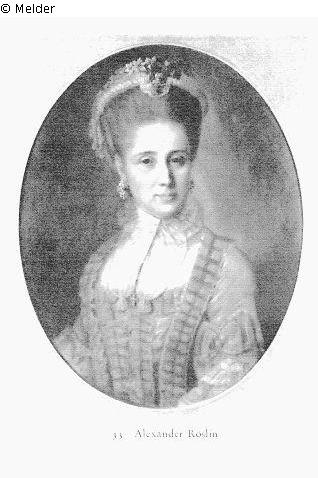 In blaugrauem, elegantem, mit Blenden besetztem Kleid, eine Spitzenrüsche um den Hals. Auf dem graugepuderten Haar ein Spitzenhäubchen mit rötlichen Blumen. Der dunkelgraue Hintergrund lichtet sich nach rechts blaugrau auf. Oval. Quelle: Hans W. Lange: Gemälde und Kunstgewerbe aus einer bekannten Privatsammlung - Verschiedener Kunstbesitz. Berlin. Versteigerung am 22. und 23. Juni 1939. Katalognummer 33 (Dresdner Bank, Berlin); Fotografie [Ausschnitt], ohne Datum [um 1935]. In: Nachlaß Feist, in: Literaturarchiv Marbach.