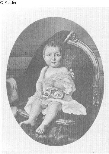 Ovales Ganzfigurenbildnis, das Kind sitzt in einem Stuhl oder Sessel auf einem Kissen, leicht nach rechts zur Seite gedreht, Blickkontakt; auf der Lehne im Hintergrund ein Hermelinmantel; das Kind mit einem weißen Tuch bekleidet, zahlreiche Blumen auf dem Gewand im Schoß; Signatur: Verso: C. F. R. de. Liszewsky . pinxit. Anno 1780; Maße: 90 x 73,5 cm
