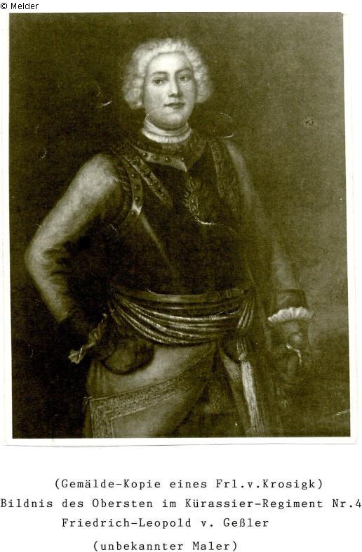 Gemälde-Kopie des ehemals in der Porträtgallerie des Potsdamer Stadtschlosses befindlichen Originals, den Oberst v. Geßler darstellend; Kopie wurde vor dem Ersten Weltkrieg von einem Frl. v. Krosigk gemalt; das Original war 1721 datiert.
