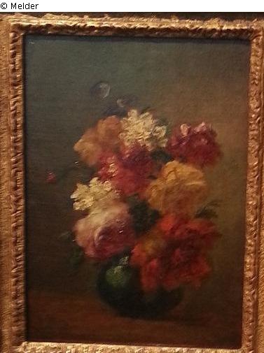 farbenbunter Strauss von Rosen, Narzissen und anderen Blumen in grüner Glasvase vor einem olivfarbenem Hintergrund, bez. u. l.: N. Diaz