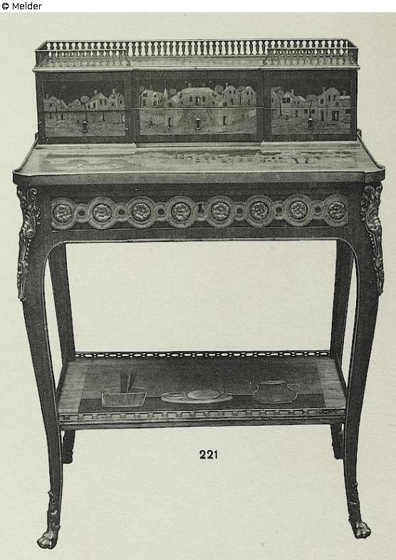 Rosenholzfurnierung auf Eiche mit reicher Intarsia und Bronzebeschlag. Vier schlanke geschweifte Beine, die in der unteren Hälfte durch ein Zwischenbrett verbunden werden. Aus der vorderen Zarge zieht sich eine Schieblade, geschlossen durch zwei seitliche Klappen und ein mittleres Hochstellpültchen. Über dem hinteren Drittel der Platte erhebt sich ein niedriger Aufsatz mit sechs Schieblädchen, von denen zwei mit Geheimverschluß versehen sind. Die in farbigen Hölzern ausgeführten Intarsien verteilen sich auf alle vier Seiten sowie auf die äußeren und inneren Platten des Freistellmöbels und bestehen aus Landschaftsdetails, Häusergruppen, die sich zu ganzen Straßenprospekten weiten, Amphoren, Hydrien und sonstigem Ornamentalen. Die Bronzebeschläge bestehen aus einem Rosettenfries, Masken und Galerie. Sehr verwandt mit einem Möbel gleichen Typs der Sammlung de Polis, das Vandecruse (De Lacroix) signiert ist. Vgl. Auktionskatalog G. Petit, Paris, 1927 Nr. 293. Quelle: Hugo Helbing Kunsthandlung und Kunstversteigerungshaus: Kunstbesitz eines Berliner Sammlers. Katalog Nr. 49; Math. Lempertz'sche Kunstversteigerung: Eine bekannte Süddeutsche Privatsammlung und anderer Privatbesitz, Katalog Nr. 395. (DOI: Externer Link) (DOI: Externer Link)