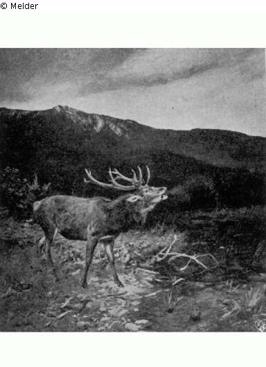 Abenddämmerung, röhrender Hirsch vor Gebirge