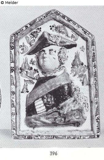 Brustbild in Manganbraun, Ockergelb und Grün gemalt, unter dem Hintergrund Blumen, Hochrelief