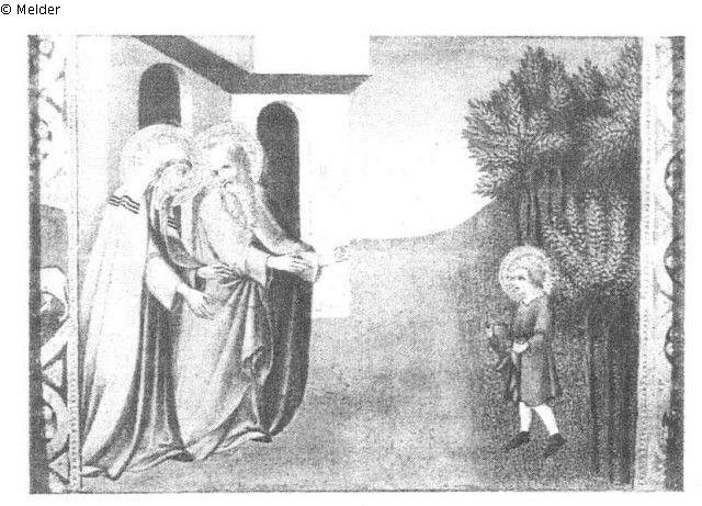 Links vor einer Architektur die Heiligen in blauem beziehungsweise rotem Mantel. Sie zeigen beide auf den Knaben, der vor einem Wald steht und ihnen mit Blumen in der Hand entgegenkommt. Rechts und links Reste von rahmenden Streifen. R.