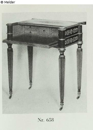 Empire, Mahagoni, Gegenstück zu 659, auf kannelierten Beinen und reichem fein ziselierten Goldbronze-Schmuck, die Tischplatte mit Messing-Intarsien. Die Vorderwand aufklappbar, dient, herausgezogen, als Schreibplatte und ist mit rotem Maroquin bezogen und Goldornament. Hersteller-Vermerk: Lemarchand, Ebeniste du Garde-Meuble de la couronne, Rue du Pas de la Mule, pres de la Place Royale, Paris. Quelle: Kunsthaus Heinrich Hahn: Sammlung V. O., Gemälde, Möbel des 18. Jahrhunderts, Metallarbeiten, aus verschiedenem Privatbesitz, Gemälde alter Meister, Gemälde und Handzeichnungen. Auktion vom 07.-08.05.1940 (Katalog Nr. 61). Frankfurt a. M. 1940. Kat. Nr. 658.