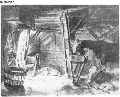 Das Innere eines Stalles mit Pferd, Kuh und Kalb