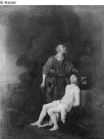 Bezeichnet rechts unten: „Rembrant“ (über einer verlöschten Bezeichnung); Isaak, bekränzt mit Efeu, sitzt auf einem grünen Tuch gegen den Altar gelehnt, hinter ihm steht Abraham in rotem Rock, das Messer in der Rechten, und schaut zum Engel empor, der mit ausgebreiteten Armen herabfliegt. Links Ausblick in die Landschaft.