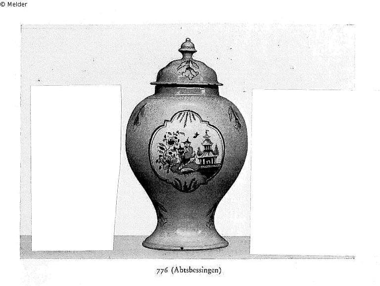 Eine Deckelvase. Auf gelbem, von einigen Streublumen belebtem Grund blau gerahmte Reserven, die alle das gleiche Motiv, einen sitzenden Chinesen in einer Landschaft, enthalten. Abtsbessingen (Marke: K); Hö