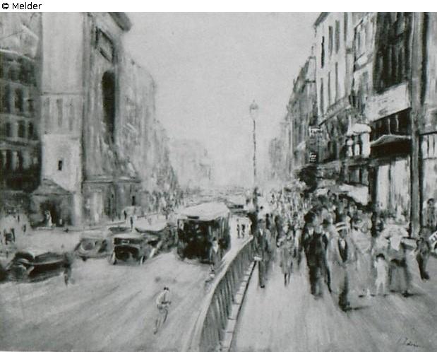 Das Bild zeigt eine belebte Straßenszene auf dem Boulevard Poissonnières in Paris. Ein Geländer und eine Laterne teilen die Ansicht in zwei Hälften: rechts strömen zahlreiche Menschen über den Gehweg, während sich links Autos die Straße entlang bewegen. Die Szenerie wird von hohen Gebäuden eingerahmt.