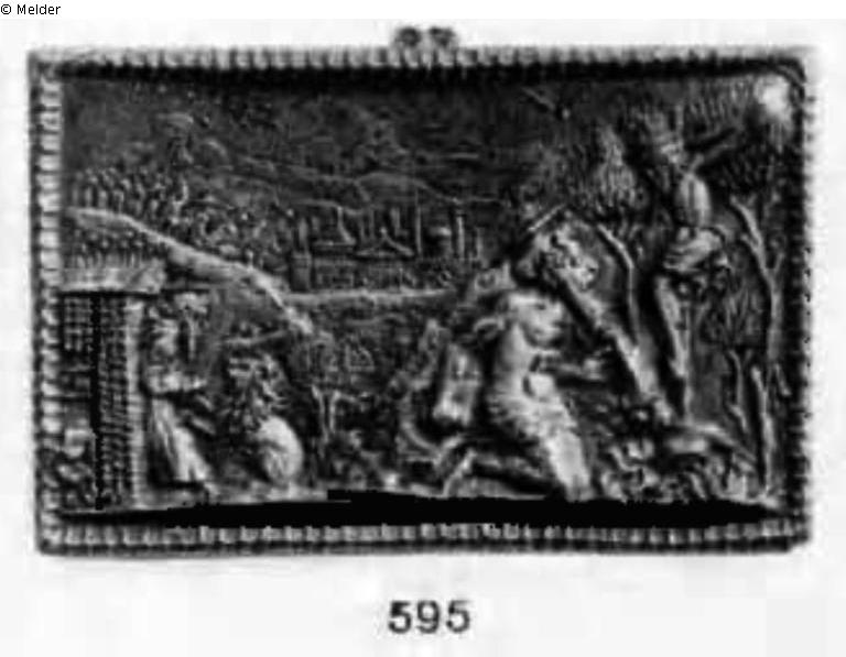 Bange-WV, Nr.: 595 (Α. N. 893. Inv. 1201.) Titel: Der hl. Hieronymus. Vor einem Kruzifix zu äußerst rechts kniet der mit einem Lendentuch bekleidete Heilige, in der Rechten einen Stein haltend. Links, etwas zurück, der Heilige vor der Hütte im Begriff, dem Löwen den Dorn aus der Tatze zu ziehen. Weiter hinten ein Zug von Reitern, der sich auf eine Stadt zu bewegt. Auf der Stadtmauer die Inschrift: ROMA · SPQR. Rand durch Zahneinschnitte verziert. Andere Exemplare, z. B. das im Louvre befindliche (bei Molinier abgebildet), zeigen am unteren Rande die Inschrift: IHOANNIS . FRANCISI . PARVENSIS . OPVS. Halbrelief. Bronze, vergoldet. H. 5,3, Br. 8,1 cm. Am Rande die Öse ausgebrochen. Später unterhalb durchbohrt;