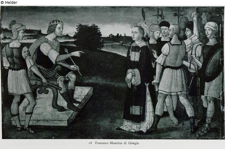 Vor einer weiten, etwas hügeligen Landschaft steht der Heilige in schwarzrotem Diakonenmantel und weißem Unterkleid vor einer starken, ihm folgenden Gruppe von Anklägern und Häschern gegenüber einem links sitzenden König auf niedriger Estrade, der ihn verhört und ausfragt. Neben dem König steht ein Scherge. Alle Personen in farbigen Kostümen, aus denen ein leuchtendes Feuerrot sich besonders hervorhebt.