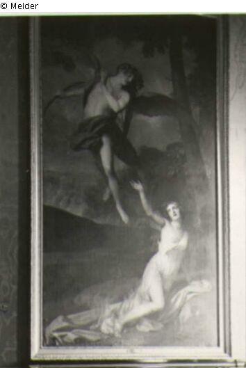 In der Luft schwebender Engel mit Bogen und weibliche Person in Landschaft