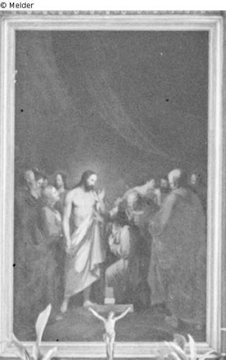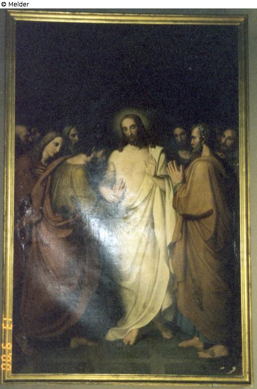 Das Bild zeigt die im Johannes-Evangelium, Kap. 20, überlieferte nachösterliche Geschichte des Zusammentreffens von Jesus mit seinen Jüngern. Der „ungläubige Thomas“ (rechts von Jesus) wird aufgefordert, seine Hände in die Wunden der Kreuzigung zu legen. Thomas steht auf der rechten Seite
