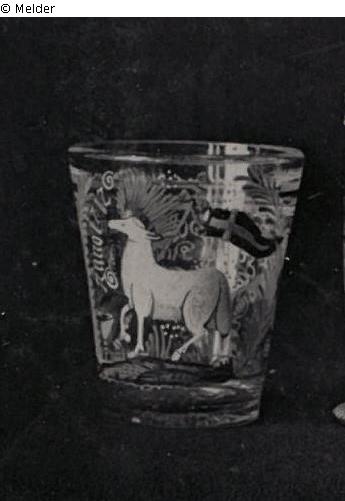Deutsches Glas mit Emailbemalung: Gotteslamm mit Kreuzesfahne, darüber - 1712 - . Rückseite Spruch über Blumen: „Siehe das ist Gottes Lamm das der Welt Sünde trägt“.