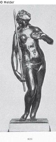 Stehend, unbekleidet, den Blick nach oben gerichtet, greift mit ihrer Linken an ihre linke Brust. In der gesenkten Rechten hält sie den oben abgebrochenen Speer. Das kunstvoll geflochtene Haar, von dem einige Locken auf die Schulter herabfallen, ist mit einem Diadem geschmückt. Vereinzelte Gußfehler.