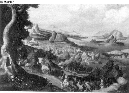 Die Bekehrung des Saulus, In einer von einem Fluß durchzogenen phantastischen Landschaft, links mit der Stadt Jerusalem, kommt aus einem Hohlweg rechts der Zug des Saulus. Dieser, vom Blitzstrahl getroffen, liegt am Boden, während sein Pferd erschreckt davonspringt. Den linken Bildrand nimmt ein mächtiger Baum ein. Auf dem Baumstamm im Mittelgrund Reste des Monogramms