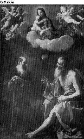 Tafelmalerei: Bild: der heilige Antonius Abbas und der heilige Paul der Einsiedler treffen und unterhalten sich, ein Rabe mit einem Brotlaib (manchmal mit zwei Brotlaiben) im Schnabel fliegt zu ihnen herunter; Paulus von Theben (Heiliger); Treffen; Konversation; Rabe; Laib