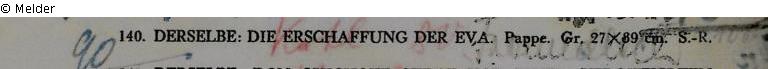 Sammlung Eduard Fuchs bis 1933; 25.10.1933 Beschlagnahmung durch die Gestapo; Versteigerung Auktionshaus Rudolph Lepke, Berlin, Katalog 2114, S. 16. Am 16.06. und 17.06.1937 wurde das Gemälde als Nr. 140 „Die Erschaffung der Eva. Pappe 27 x 39 cm. Silberrahmen“ versteigert; ersteigert von einem bisher nicht identifizierten Kunsthändler oder Sammler mit Namen Freundlich für 90,- RM (Schätzpreis: 100,- RM); Verbleib unbekannt