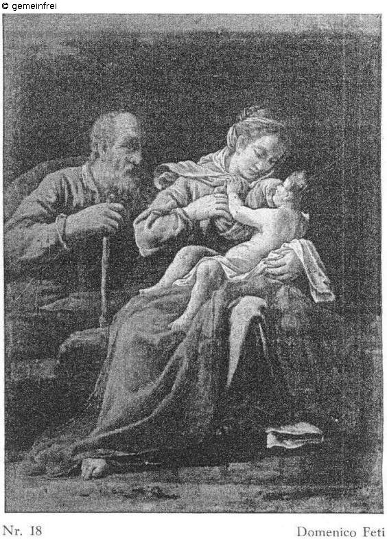 In Bildmitte sitzende Maria mit dem Jesusknaben auf dem Schoss, der sich ihr zuwendet. Sie hat den Blick auf ihn nach rechts unten gesenkt. Links hinter ihr Josef einen Stock haltend.