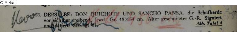 Sammlung Eduard Fuchs bis 1933; 25.10.1933 Beschlagnahmung durch die Gestapo; Versteigerung Auktionshaus Rudolph Lepke, Berlin, Katalog 2114, S. 14. Am 16. und 17.06.1937 wurde das Gemälde als Nr. 116 „Don Quichote und Sancho Pansa, die Schafherde vor sich hertreibend. Leinwand, 48 x 64 cm. Alter geschnitzter Goldrahmen. Signiert und datiert: Slevogt 07“. Abb. Tafel 4.“ versteigert; ersteigert von dem Lepke-Kommissionär Carl Braunstein (Berlin-Lichtenrade, Straße 6a Nr. 25 - wahrscheinlich im Auftrag des Hamburgers Fritz Slevogt für 500,- RM - Schätzpreis 450,- RM); später Düsseldorfer Privatbesitz; Verbleib unbekannt