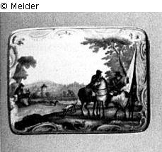 Rechteckig. Auf der Wandung in Umrahmungen aus purpurfarben staffierten Reliefrocaillen mit bunten Blumen Landschaftsszenen in der Art der niederländischen Genremaler des 17. Jahrhunderts. Innen im Deckel schlafende Nymphe am Bach, von einem Faun belauscht. Gravierte Goldfassung.