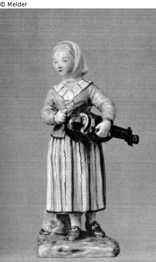 - in gerader Haltung stehend, den Kopf halbrechts gedreht, hält sie das Instrument unter dem linken Arm und bewegt mit der rechten die Kurbel; sie trägt ein weißes, unterm Kinn verknotetes Kopftuch, eine hellviolette Jacke mit dunkelvioletter Verschnürung und Borte, ein rotgestreiftes weißes Schultertuch, einen weiß, violett und rot gestreiften Rock, weiße Strümpfe und rote Schuhe mit weißen Schnallen,