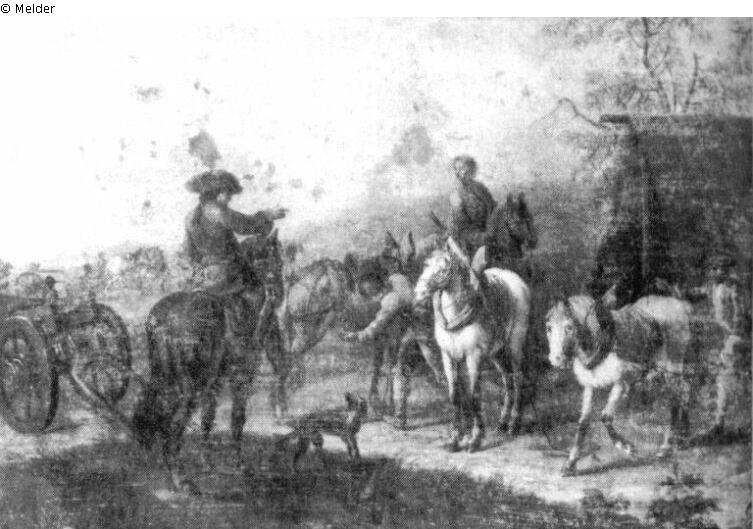 To the left is an officer on horseback, behind him is a cannon. To the right are three saddled horses, a soldier, and a rider.