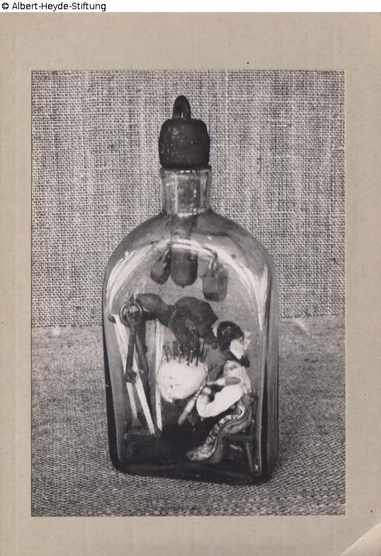Vierkantflasche aus dickwandigem, farblosem Glas mit rechteckigem Querschnitt, runder Schulter und kurzem Hals, "eingerichtet" mit Darstellung eines bärtigen Webers an seinem Webstuhl aus geschnitztem, polychrom gefasstem Holz und diversen anderen Materialien, augenscheinlich Garn, Stoff, Nägel und Schlüssel, einfacher geschnitzter Verschluss, der von innen an einem langen Zapfen mit zwei Schlössern verschlossen ist, die an einem Querbalken hängen. Derartige Erzeugnisse der Volkskunst, bei denen kunstvoll gestaltete Themendarstellungen irreversibel in eine Flasche eingebracht und verschlossen werden, bezeichnet man als "Eingericht" oder "Geduldsflaschen". Dieses ziemlich rustikale Beispiel datiert ins 19. Jahrhundert, seine Herkunft ist unklar, möglicherweise Sachsen. Den Proportionen nach zu urteilen ist es eher kleinformatig.