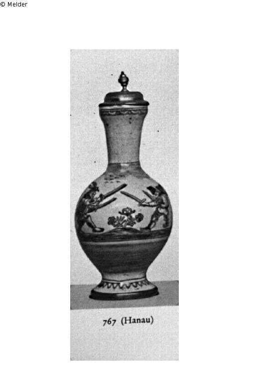 Vorn auf der Wandung zwei mit Schwertern kämpfende Callotsche Zwerge in Blaumalerei. Klappdeckel und Fußring aus Zinn. Hanau (?)