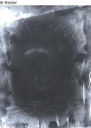Tuch: Purpurfarbene Seide. Im Mittelfeld zur Sonne fliegender schwarzer Adler mit Schwert und Zepter, auf der Brust Monogramm "FR". Blaues Devisenband mit Inschrift "NEC SOLI CEDIT". Bandelier: Rote Seide mit Silberstickerei. Später angenagelt. Stange: Weiß lackiert. Abgebrochene Lanzenspitze. Stange: 320 cm