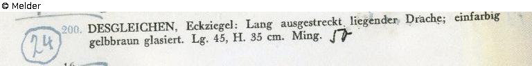 Sammlung Eduard Fuchs, erworben zwischen 1912–1922 und in dessen Besitz bis 1933; 25.10.1933 Beschlagnahmung durch die Gestapo; zwangsweiser Verkauf (Zahlung Reichsfluchtsteuer) 1937 durch seine Tochter Gertraud Fuchs: Versteigerung Auktionshaus Rudolph Lepke Berlin, Katalog 2115, S. 16 - am 15.10 und am 16.10.1937 wurde dieser Dachreiter unter Nr. 200 versteigert: „FAYENCE-DACHREITER. Eckziegel: Lang ausgestreckt liegender Drache; einfarbig braun glasiert. Länge 45 cm. Höhe 35 cm. Ming“.