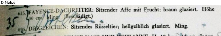 Sammlung Eduard Fuchs, wahrscheinlich erworben nach 1924 und in dessen Besitz bis 1933; 25.10.1933 Beschlagnahmung durch die Gestapo; zwangsweiser Verkauf (Zahlung Reichsfluchtsteuer) durch seine Tochter Gertraud Fuchs: Versteigerung Auktionshaus Rudolph Lepke Berlin, Katalog 2115, S. 39 - am 15.10 und am 16.10.1937 wurde dieser Dachreiter unter Nr. 625 versteigert: „FAYENCE-DACHREITER: Sitzender Affe mit Frucht; braun glasiert. Höhe 30 cm Ming (Beschädigt)“.