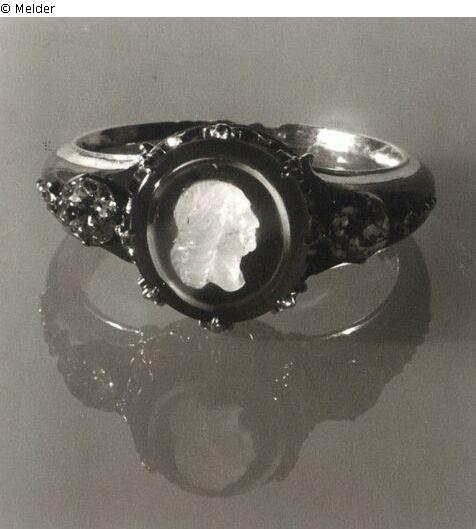 Ein Ring mit einem einem Karneol, darauf ein geschnittener Kopf, daneben zwei kleine Brillanten; der Ring ist mit Karneol belegt;