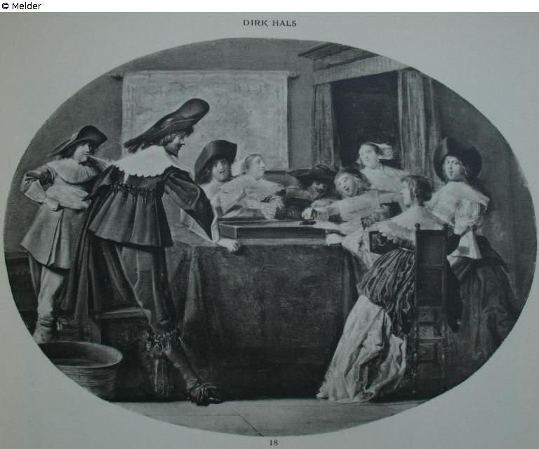 oval, signiert. Mit freudigen Gesichtern an einem Tisch spielende Jugendliche. Ihre Kleidung ist fein und mit großen Halskrausen. Ein stehender Herr trägt aschgrauen Satin und stützt sich auf dem Tisch ab