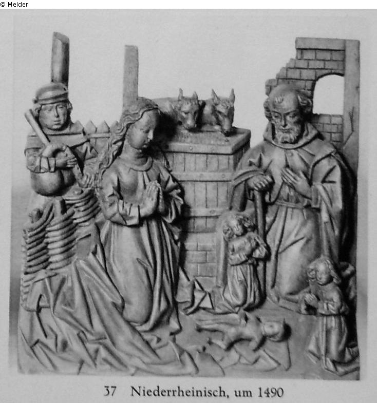 Vor dem Jesuskind, das auf dem Boden liegt, knien Maria, Joseph, zwei Engel. Links hinter einer Hecke ein Hirte, Reliefgruppe, zugehörig zu: VerkündigungGundersheimer Gutachten S. 129, Nr. 17
