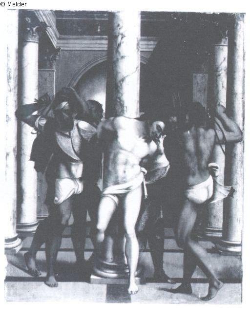 Christus in bewegter Haltung vor einer runden Säule in einer Halle der italienischen Hochrenaissance; rechts und links die Kriegsknechte; Graf von Ingenheim´sche Bildersammlung, Erbinventar - Gemäldeverzeichnis: Nr. 45, Reisewitz, 1883.