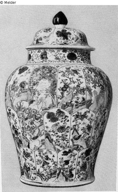 nach unten eingezogener, oben gebauchter Körper, gewölbter Deckel. Die Wandung bemalt in den Schmelzfarben der famille verte mit drei breiten Bordüren, aufgeteilt in hochstehende Ovalfelder mit Blumen- und Landschaftsfüllung. Auf dem Hals Ranke mit Päonien und Chrysanthemenblüten. Der Deckelknauf gekittet, die Glasur stellenweise abgesprungen.