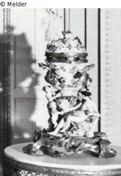 Lange: "Meißner Porzellan und französische Goldbronze der Louis XV-Zeit. Auf einem Steinsockel ruht ein urnenförmiges Deckelgefäß, umrankt ebenso wie der gewölbte Deckel von Weinreben, die auch die Henkel bilden. Auf dem flachen, mit Früchten belegten Sockel die Figur einer nackten Frauengestalt, lose von einem blumenbemalten, goldbordierten Mantel umhüllt, und drei Putten, von denen eins einen Kranz darbringt und die beiden anderen Weintrauben pflücken. Geringe Reparaturen. Die Fassung aus feuervergoldeter Bronze, gebildet aus Rocaillen, Schilfblättern und Weinlaub in besonders großzügig geschwungenen, stark plastischen Formen. Modell von Kändler. [...] Aus der Sammlung Hermine Feist-Wollheim." Montierung: Paris, 1750 (um)