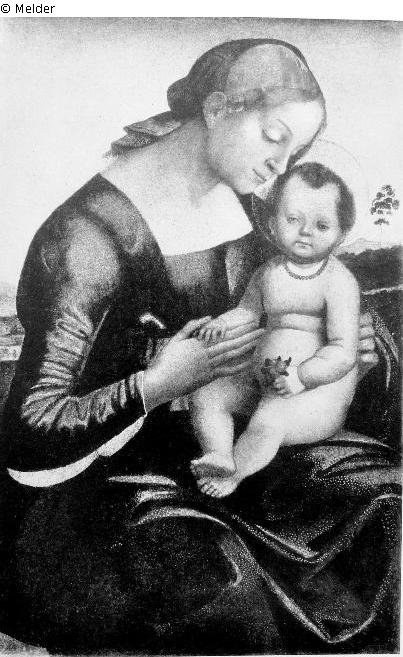Die Mutter Gottes sitzt als Kniefigur halb nach rechts vor einem weiten Landschaftsgrund und blickt liebevoll zu dem auf ihrem Schoße sitzenden Christuskind, das seinen Blick auf den Beschauer richtet. Sie trägt ein enganliegendes rotes Kleid mit viereckigem Halsausschnitt und dunkelgrünem Mantel. ; Literatur: Abbildung Versteigerungskatalog Tafel 5; Venturi, Band VII/II, Seite 297 und 407