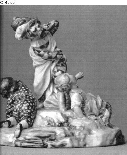 In der Mitte des runden Steinsockels steht ein als Harlekin verkleidetes Mädchen, das die Peitsche aus dem Gürtel zieht und seine zwei jüngeren Spielgefährten, einen Knaben und ein Mädchen, mit vorgehaltener bärtiger Maske und spitzem Räuberhut erschreckt. Das kleine Mädchen fällt hinten über und wehrt den Räuber mit der linken Hand ab. Der kleine Knabe kniet, die linke Hand auf dem Hut, am Boden, hält die rechte Hand ans Gesicht und wendet sich entsetzt ab. Der Räuber trägt unter goldbordiertem weißen Mantel ein aus roten, gelben, schwarzen, violetten, grünen und blauen Flicken zusammengesetztes Harlekinkostüm, gelbe Stiefel und grünen Hut mit roter und weißer Straußenfeder, das kleine Mädchen rotpunktiertes Mieder, blaugestreifte Schürze, grün, rot, violett gestreiften Rock und rote Schuhe, der Knabe einen roten Anzug mit einem Muster schwarzer Punkte in weißen Kreisen, weiße Strümpfe und schwarze Schuhe. Hinter dem Räuber steht ein Korb mit weißem Tuch, daneben liegt ein bunter Kranz. Der Steinsockel grün und braun staffiert. - Vergl. Hofmann, Frankenthaler Porzellan, Taf. 143, Nr. 578, nach dem unbemalten exemplar im Besitz des Altertumsvereins in Frankenthal. Blaumarke: C T und 83 unter Krone. Eingeritzt: A C L.
